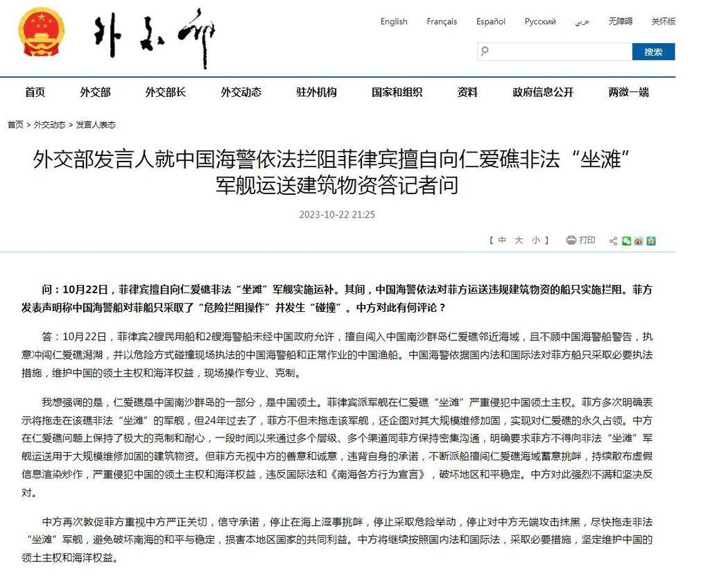 问:10月22日,菲律宾擅自向仁爱礁非法“坐滩”军舰实施运补。其间,中国海警依法对菲方运送违规建筑物资的船只实施拦阻。菲方发表声明称中国海警船对菲船只采取了“危险拦阻操作”并发生“碰撞”。中方对此有何评论?