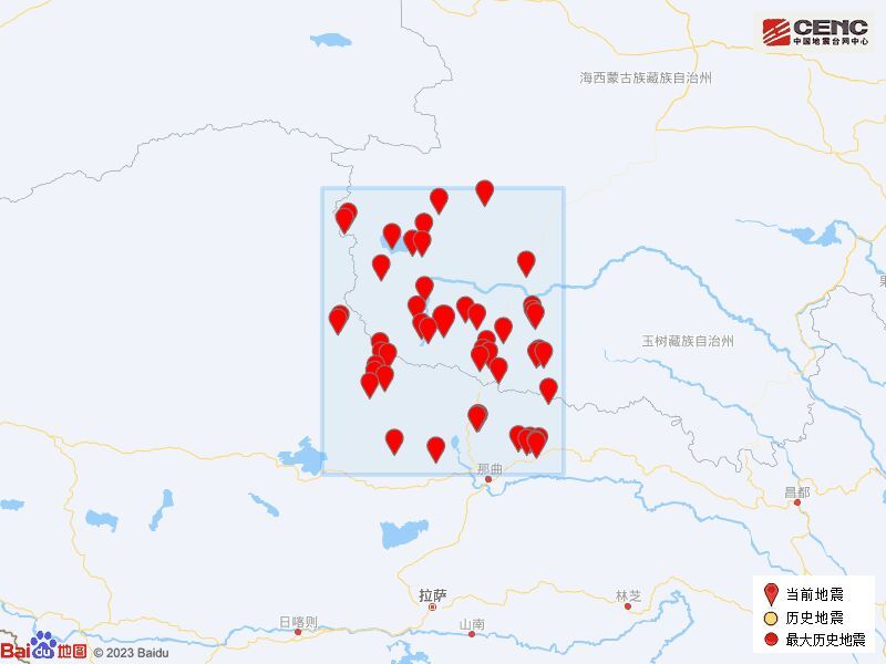 历史地震:根据中国地震台网速报目录,震中周边200公里内近5年来发生3级以上地震共91次,最大地震是2021年3月19日在西藏那曲市比如县发生的6.1级地震(距离本次震中226公里),按震级大小前50次历史地震分布如图。