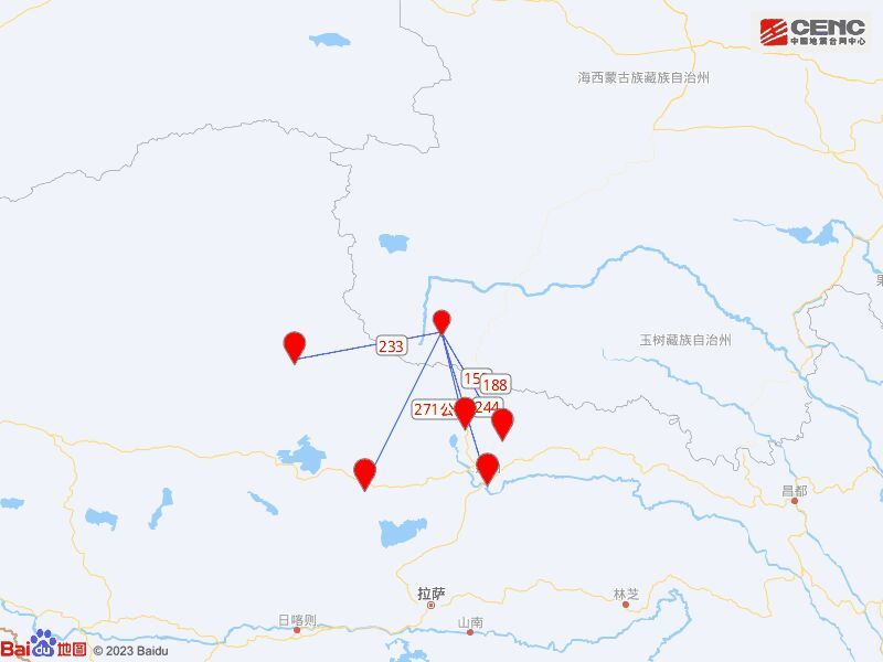 周边县城:震中距西藏安多县150公里、距西藏聂荣县188公里、距西藏双湖县233公里、距西藏??色尼区244公里、距西藏班戈县271公里,距西藏那曲市243公里,距拉萨市437公里。