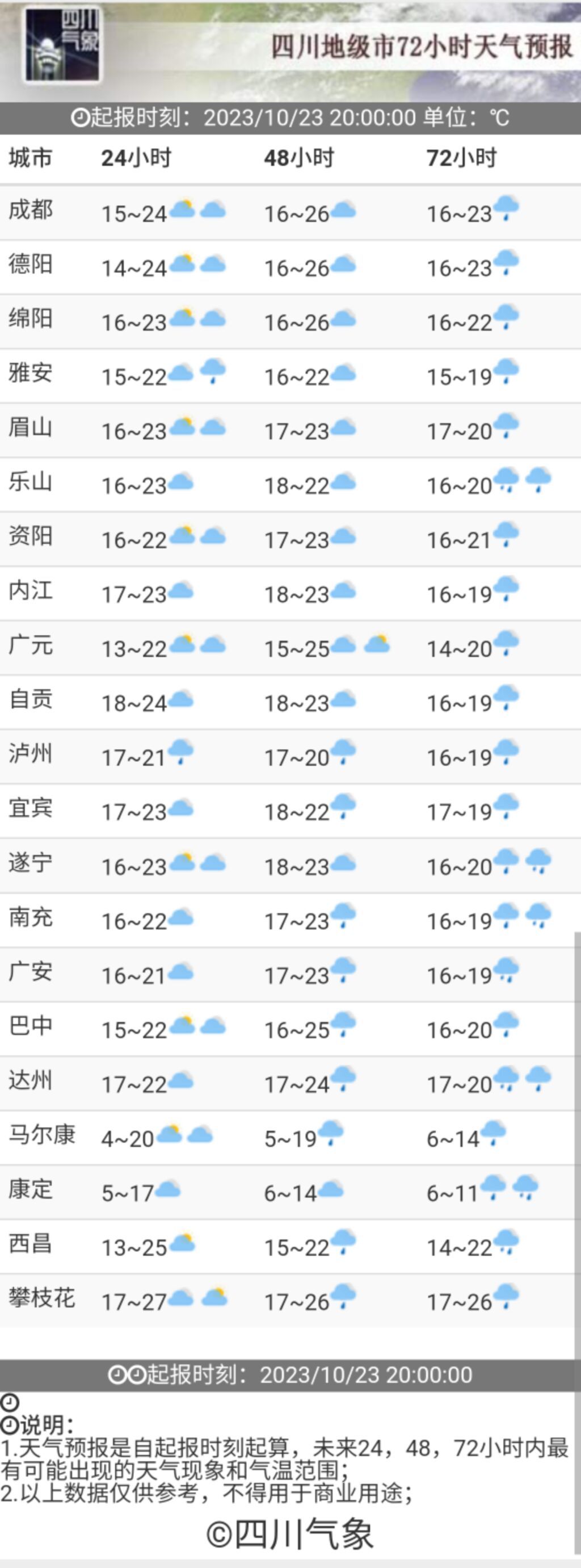★ 结合中央气象台和四川省气象台的预报,10月下旬,影响四川的冷空气较弱,旬中前期大部以多云到阴的天气为主,旬中后期有一次降温降水天气过程,之后以多云或多云间晴的天气为主。未来一周,西南区域大部大气扩散条件较好,但是四川盆地南部局地有短时轻度霾。