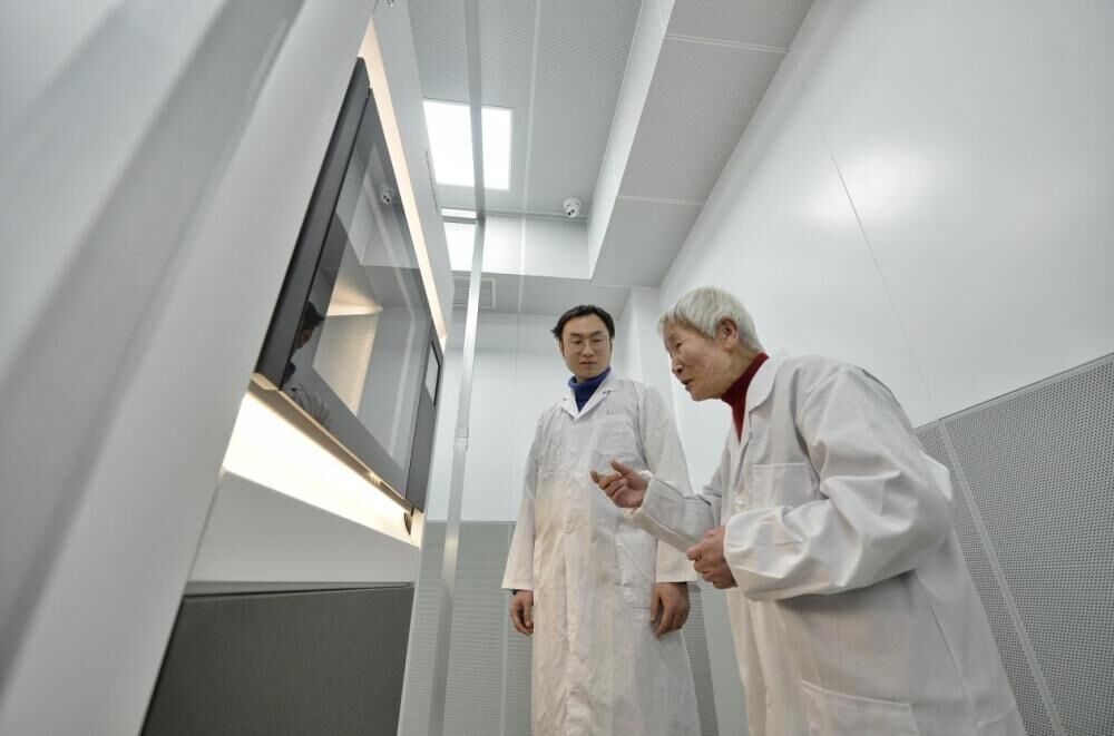 2022年2月25日,戴受惠在实验室指导孙子姚力夫。新华社记者 刘坤 摄