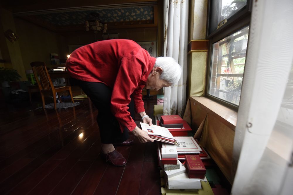 2022年9月29日,戴受惠在整理堆在客厅角落的获奖证书。新华社记者 刘坤 摄