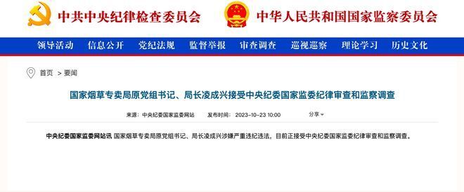 10月23日,中央纪委国家监委网站发布消息,国家烟草专卖局原党组书记、局长凌成兴涉嫌严重违纪违法,目前正接受中央纪委国家监委纪律审查和监察调查。