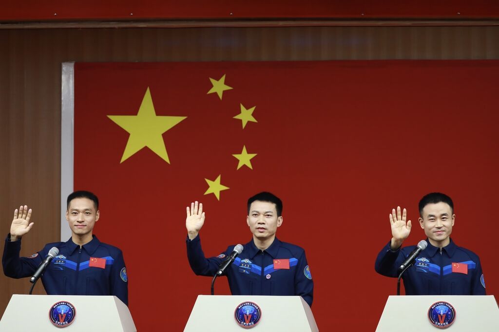 北京时间10月25日11时,执行神舟十七号载人飞船飞行任务的航天员乘组汤洪波、唐胜杰、江新林3名航天员在酒泉卫星发射中心问天阁与中外媒体记者集体见面。