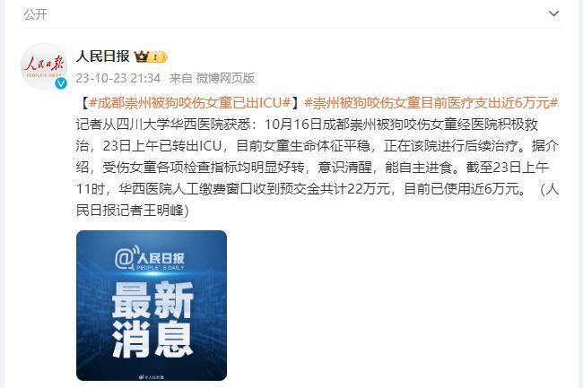 记者从四川大学华西医院获悉:10月16日成都崇州被狗咬伤女童经医院积极救治,23日上午已转出ICU,目前女童生命体征平稳,正在该院进行后续治疗。