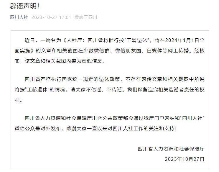 近日,一篇名为《人社厅:四川省将推行按“工龄退休”,将在2024年1月1日全面实施》的文章和相关截图在少数微信群、微信朋友圈、自媒体等网上传播。10月27日,四川省人力资源和社会保障厅发布辟谣声明表示,上述信息为假消息。