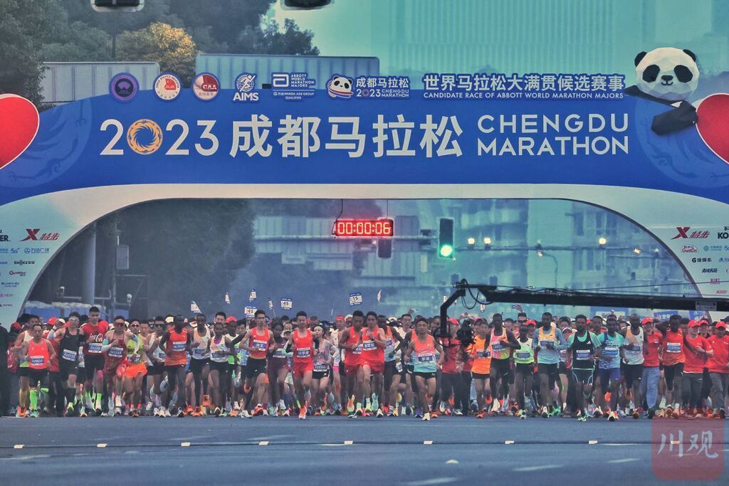 10月29日7点30分,一年一度的成都马拉松在位于承载古蜀文明厚重历史的金沙遗址博物馆鸣枪开跑,35000名来自全世界各个国家和地区的跑者迎着朝霞出发。今年成都马拉松采用分枪式起跑,半程终点设置在四川大学博物馆,全程终点设置在世纪城新国际会展中心。