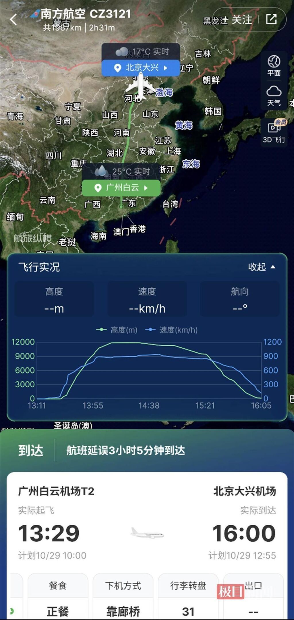 航旅纵横APP显示,CZ3121次航班计划于10月29日上午10时从广州白云机场起飞,12时55分到达北京大兴机场,但实际上延误了3小时5分钟,在下午4时才最终落地。