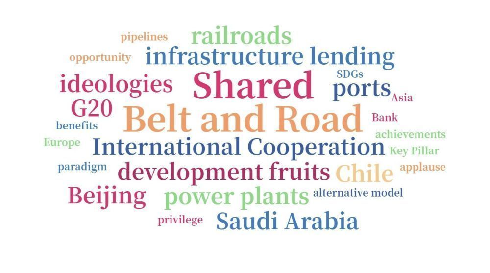 我们选择了126家美西方媒体,在第三届“一带一路”国际合作高峰论坛开幕前一周和闭幕后一周的两个时间段,抓取这些相关媒体针对“一带一路”倡议的报道,对词频进行大数据分析,所得出的“词云”如下↓