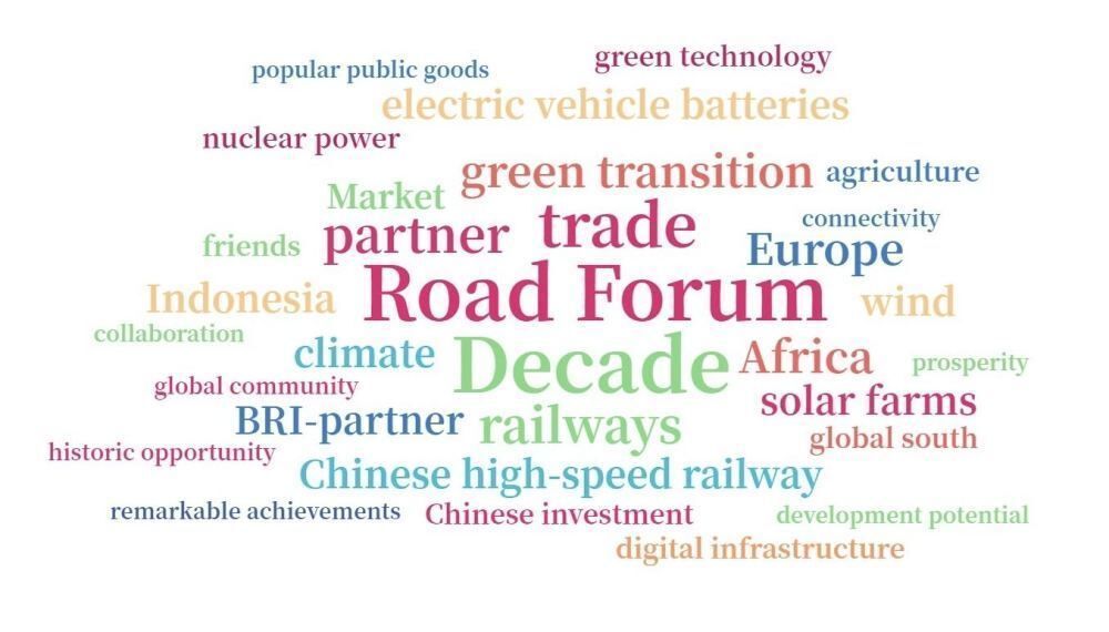 在这两个“词云”当中,国际合作、发展成就、铁路和港口等项目、共建国家等都是高频词;在论坛闭幕之后,气候、绿色转型、绿色技术等相关内容更成为热点议题。共建“一带一路”成就斐然,西方媒体想视而不见也越来越难。