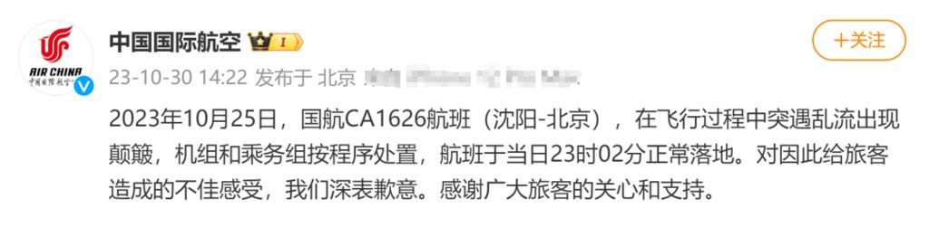 10月25日,国航CA1626航班(沈阳-北京),在飞行过程中突遇乱流出现颠簸,机组和乘务组按程序处置,航班于当日23时02分正常落地。对因此给旅客造成的不佳感受,我们深表歉意。感谢广大旅客的关心和支持。
