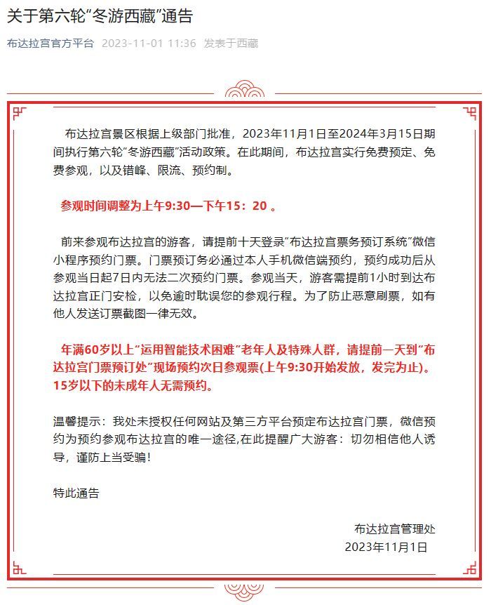 11月1日,布达拉宫官方平台微信公号发布《关于第六轮“冬游西藏”通告》,通告称,布达拉宫景区根据上级部门批准,2023年11月1日至2024年3月15日期间执行第六轮“冬游西藏”活动政策。