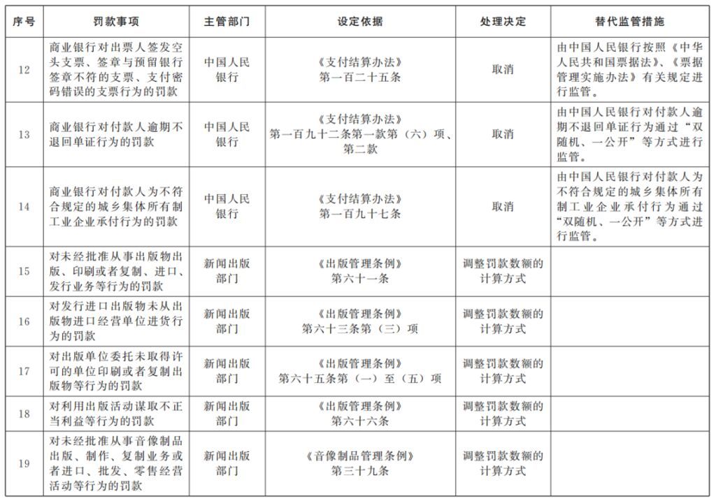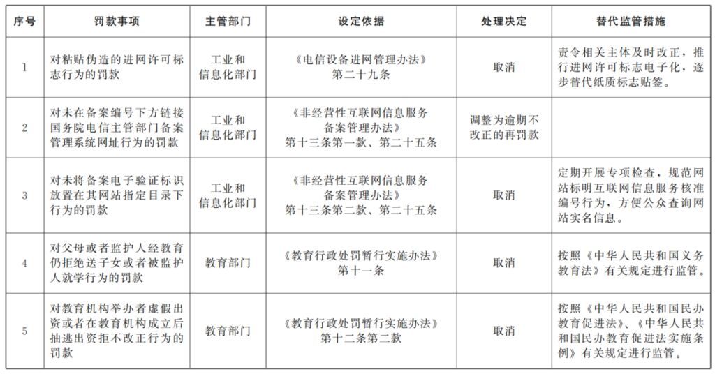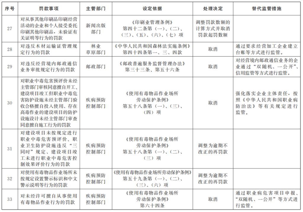 《决定》取消的16个罚款事项,包括工业和信息化部2个、教育部2个、住房城乡建设部5个、中国人民银行3个、国家林草局1个、国家邮政局1个、国家疾控局2个;调整的17个罚款事项,包括工业和信息化部1个、应急管理部1个、国家新闻出版署13个、国家疾控局2个。这些罚款事项主要集中在与企业和群众生产生活关系密切的领域,取消和调整的目的是为了切实减轻企业和群众负担。