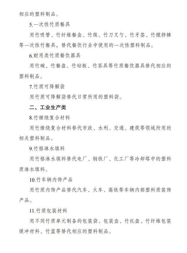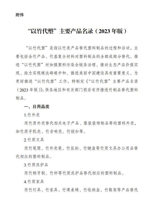 11月2日,国家发展改革委官网发布《国家发展改革委等部门关于印发〈加快“以竹代塑”发展三年行动计划〉的通知》,其中提出,到2025年,“以竹代塑”产业体系初步建立,产品质量、产品种类、产业规模、综合效益进一步提升,重点产品市场占有率显著提高。与2022年相比,“以竹代塑”主要产品综合附加值提高20%以上,竹材综合利用率提高20个百分点。
