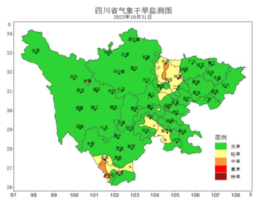 目前,全省大部地区气象干旱不明显。据监测,至10月31日,全省出现干旱37站(盆地30站),其中轻旱27站(盆地23站)、中旱9站(盆地7站)、重旱1站(盆地0站),主要分布在盆地西北和攀西地区。