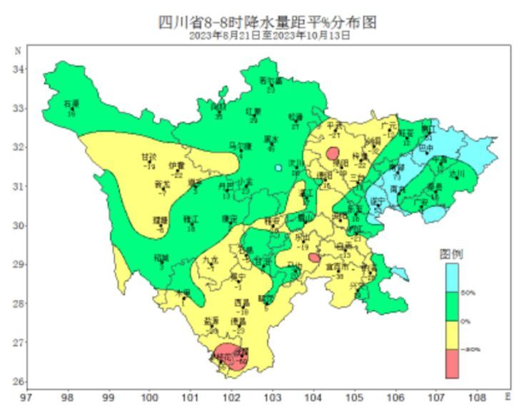 监测显示,从8月21日到10月13日,今年的秋雨季,全省平均降水量223.9毫米,较常年同期偏多1%;盆东北、盆中和川西高原大部降水量偏多1—5成,盆西北、盆西南和攀西地区大部则偏少1—5成。