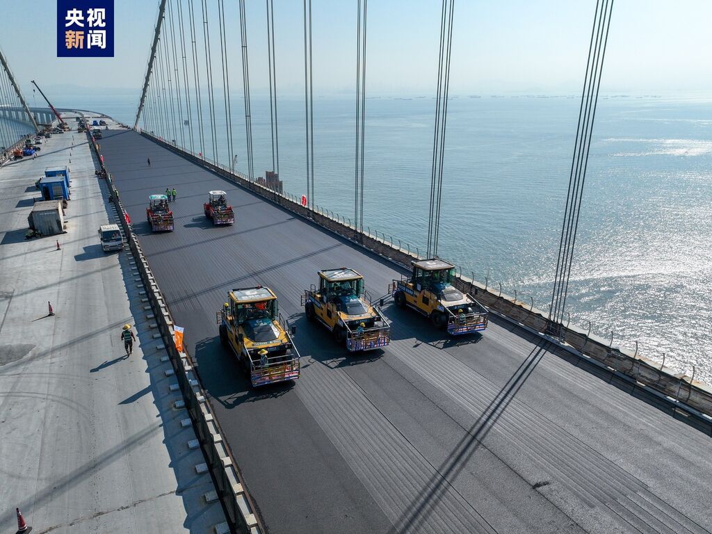 在伶仃洋大桥施工现场,2台摊铺机列队行进,7台压路机来回穿梭,200多名建设者紧锣密鼓进行桥面铺装。在他们身后,黑色沥青路面在伶仃长虹上徐徐展开。