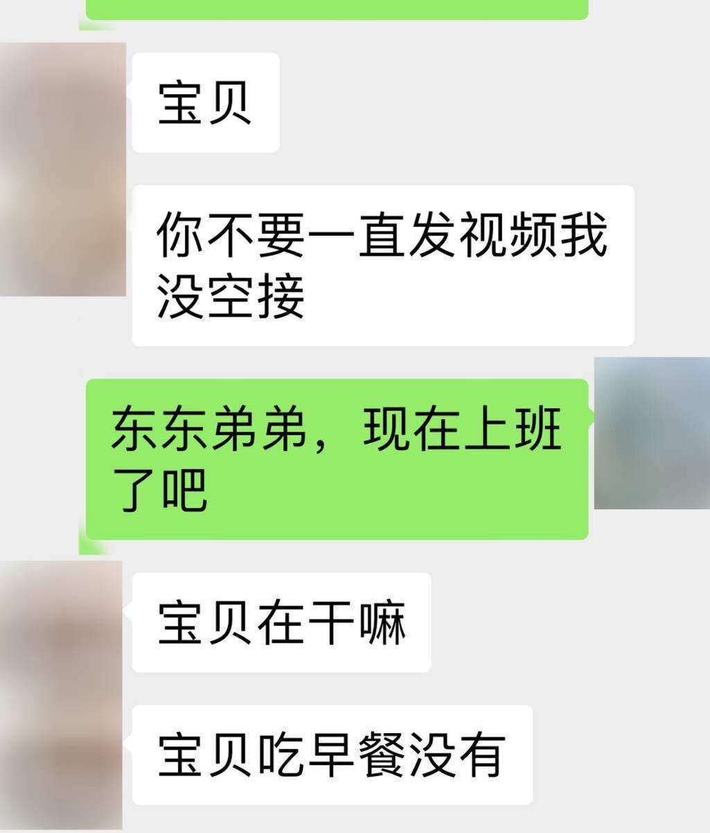 从2022年2月开始,张阿姨就在群里不断给一个叫“靳东”的用户充值打赏,不久后“靳东”就以谈恋爱的名义加上了张阿姨的微信。张先生提供的聊天记录中能找到许多“老婆”“我会娶你”“我想你了”等字眼。而张阿姨也在“偶像”一声声甜蜜的“宝贝”中逐渐沦陷,以至于到案发,张阿姨仍不相信网络上那个温柔体贴的帅气男星会是儿子口中的“诈骗犯”……