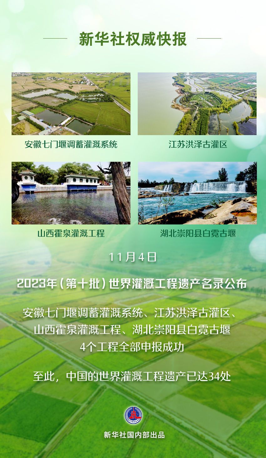 记者4日从水利部获悉,在印度维萨卡帕特南召开的国际灌排委员会第74届执行理事会上,2023年(第十批)世界灌溉工程遗产名录公布,安徽七门堰调蓄灌溉系统、江苏洪泽古灌区、山西霍泉灌溉工程、湖北崇阳县白霓古堰等4个工程成功入选。