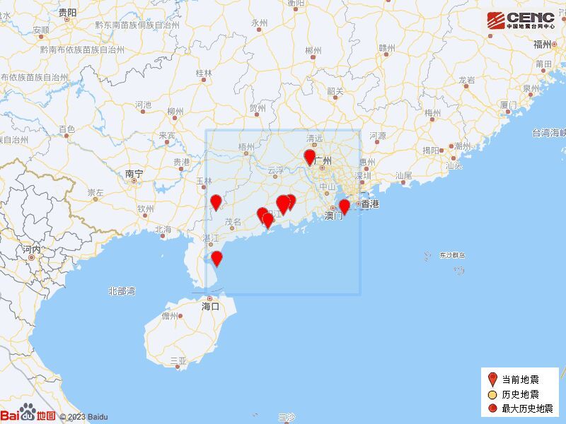 历史地震:根据中国地震台网速报目录,震中周边200公里内近5年来发生3级以上地震共9次,最大地震是2019年10月12日在广西玉林市北流市发生的5.2级地震(距离本次震中180公里),历史地震分布如图。