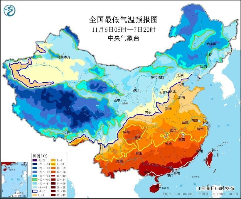寒潮蓝色预警:受强冷空气影响,预计,11月6日08时至11月7日20时,内蒙古东部、东北地区中南部、黄淮东部、江淮东部和南部、江南东部等地大部将先后降温6~8℃,其中,内蒙古东南部、东北地区中南部等地部分地区降温可达10~14℃。最低气温0℃线将位于河北北部、天津北部、山西南部至陕西关中平原、甘肃东南部一带,长江中下游以北地区有4~6级偏北风,阵风7~9级,局地可达10级;6日至7日夜间,渤海、黄海、东海等海域有7~8级风,最大阵风9~11级。