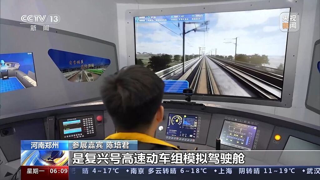 参展嘉宾 陈培君:复兴号高速动车组模拟驾驶舱,我们这项产品主要运用到了三维仿真技术、智能评判技术,可以对作业流程中一些不规范的操作进行审视和审查。