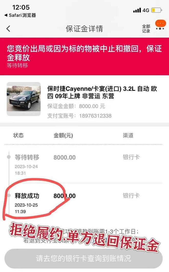 25日上午,林先生和四川明和公司对接,对方一位负责人表示,会对具体情况进行核实,但之后打电话却再联系不上。11:39分,林先生突然收到保证金被退回的通知,阿里平台上也显示“交易未履行”。27日17时,阿里拍卖人员电话回复称,由于拍卖价格低于市场价,车辆无法交付。