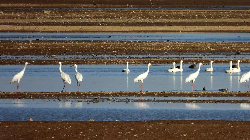 当日上午8时36分,保护区管理局工作人员在保护区沙湖辖区内监测到10余只白鹤,这是2023年鄱阳湖候鸟越冬季开启以来,鄱阳湖保护区首次监测并清晰记录到越冬白鹤的身影。