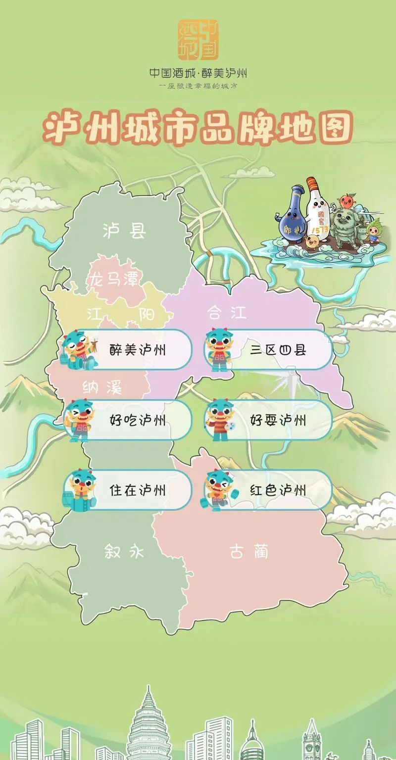 泸州城市品牌地图则是泸州特色元素的大集合,是一款展示泸州魅力的手绘网络地图,最大特点是对泸州城市品牌特色元素进行分层梳理、分类呈现。点位遍布泸州三区四县,既有况场朱德旧居、古蔺县红军四渡赤水战役遗址等泸州经典红色名片,也有酒城乐园、爱情公路、桃花坞、飘香酒谷等网红打卡地,是游客认识泸州、体验泸州的不二之选。