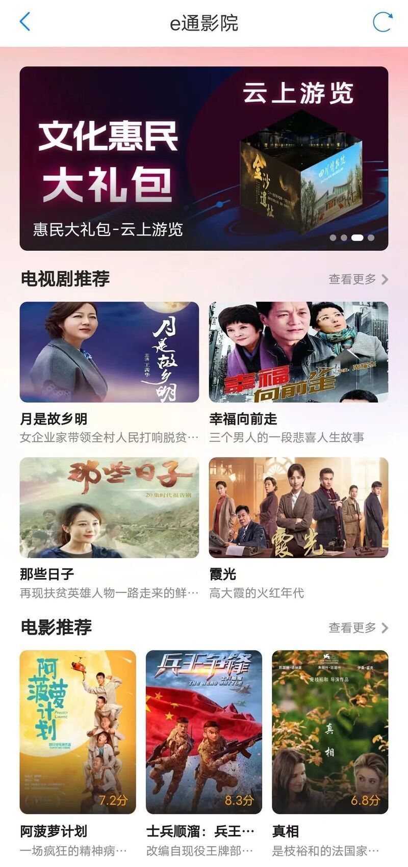 e通影院通过“文化惠民数字大礼包”数字资源,提供万部影视片(节目)、万部电子书及有声读物、百余个线上展览、微课视频服务,轻点手机,即可免费享受文化数字大礼包。
