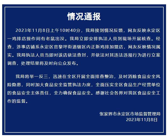 2023年11月8日上午10时40分,我局接到情况反馈,网友反映永定区一鸡排店操作间有老鼠出没。我局立即安排执法人员到现场开展核查。经查,涉事店铺系永定区官黎坪街道辖区内正新鸡排加盟店,网友反映情况属实。我局执法人员当即对该店依法查封,并依法对其违法违规行为进行立案调查,处理结果将及时向公众发布。