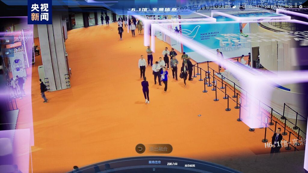 为强化精准指挥调度,消防部门专门制作了国家会展中心的三维模型,将本届参展的1888个展位全部进行了数字化标识,在指挥平台主页面可实现目标展位一键搜索和快速定位。以6.1号馆为试点,通过激光雷达和可见光融合传感器进行快速扫描,建立展台的三维精模,配置安保模型算法,将现场监控摄像头传回的二维画面与三维模型匹配,实现虚实场景交互融合。同时通过采集巡馆人员面部、着装等特征信息,利用AI算法,实时在馆内人群中标定巡馆人员,进行精准定位。一旦发现异常状况,指挥部值班人员能快速、精准地向所有驻防人员提供最佳处置线路指引和最优辅助决策。
