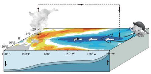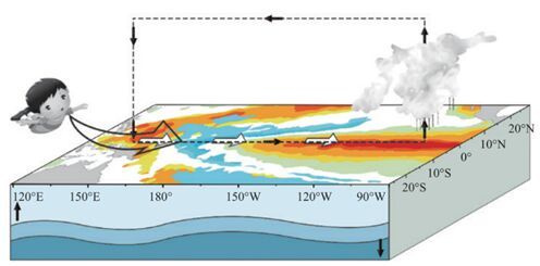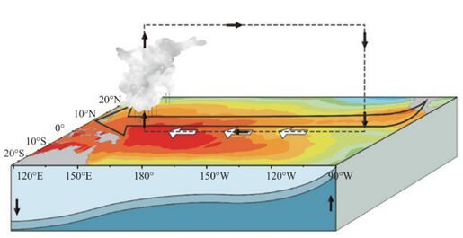热带太平洋海洋大气状态示意图(暖色系代表海温偏暖,冷色系代表海温偏冷,颜色越深,偏暖/冷的程度越大,图片引自《中国气候》,气象出版社)