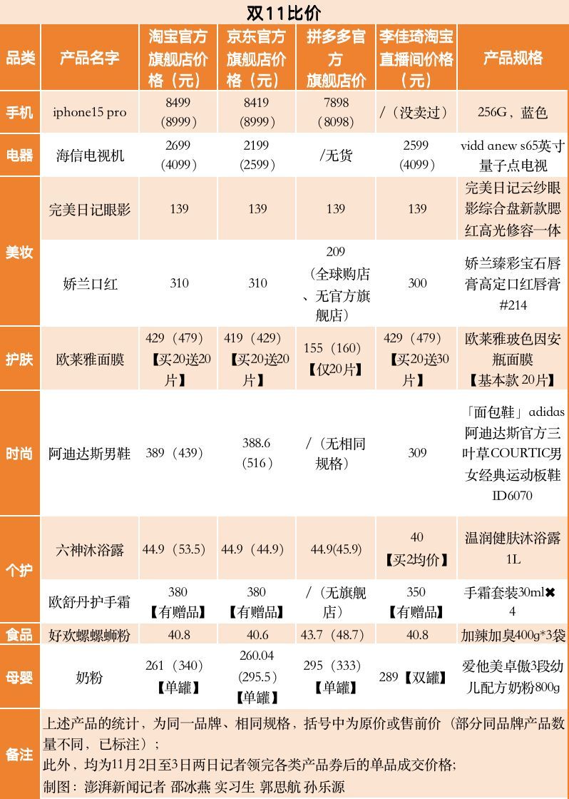需要指出的是,上述产品的统计价格均为11月2日至3日,记者领完各类产品券后的单品当日成交价格。部分平台主打满减优惠,除了店铺自身优惠折扣外,消费者若在平台凑单成功,还能够得到更低的单品成交价格。此外,直播间产品若在直播时下单,或有直播间其他红包等福利叠加,因此上述统计价格仅供消费者参考。