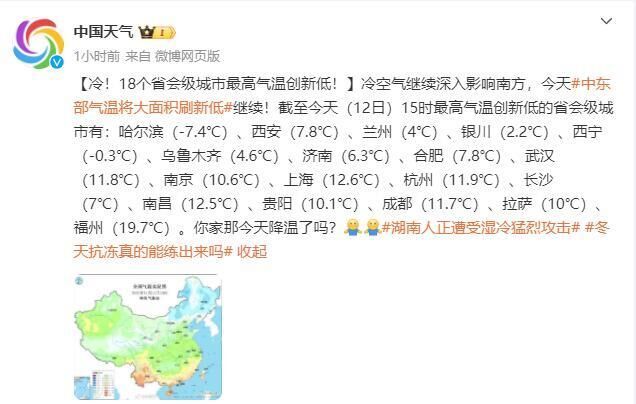 据@中国天气 微博11月12日消息,冷空气继续深入影响南方,中东部气温大面积刷新低!