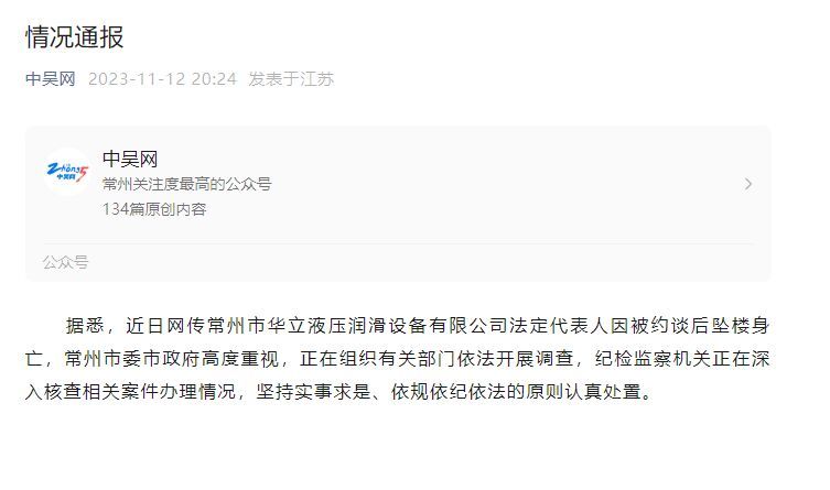 据悉,近日网传常州市华立液压润滑设备有限公司法定代表人因被约谈后坠楼身亡,常州市委市政府高度重视,正在组织有关部门依法开展调查,纪检监察机关正在深入核查相关案件办理情况,坚持实事求是、依规依纪依法的原则认真处置。
