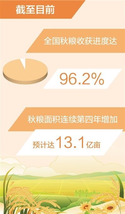 农业农村部最新农情调度显示:伴随玉米大豆及中稻收获进入尾声、南方晚稻收获加速推进,全国秋粮收获进度达96.2%,基本实现丰收到手。今年以来,我国粮食生产克服局部地区洪涝干旱等灾害影响,全年粮食产量有望再创新高。