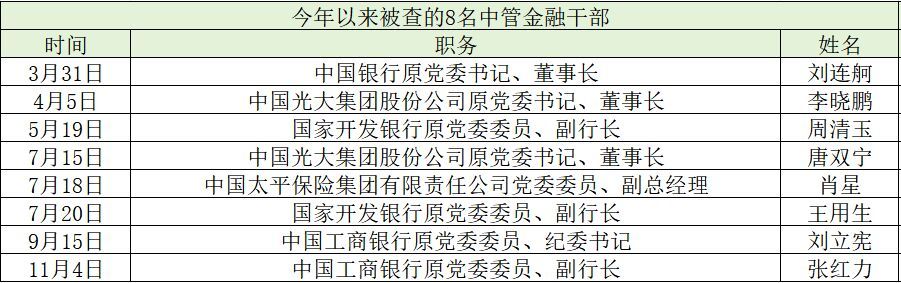 今年以来,已有8名中管金融干部被查,其中国有大行3人、金融集团2人,政策性银行2人,保险机构1人。