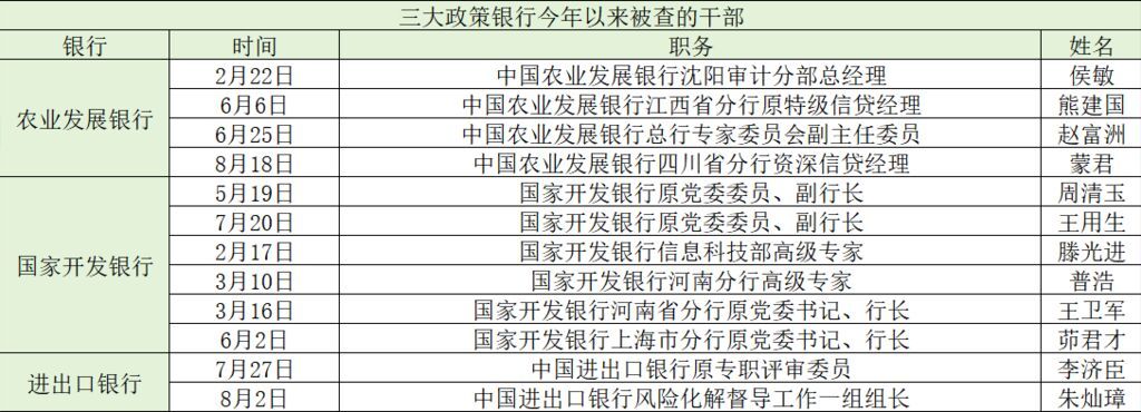 国开行、中国农业发展银行(以下称“农发行”)、中国进出口银行(以下称“进出口银行”)反腐情况也值得关注。