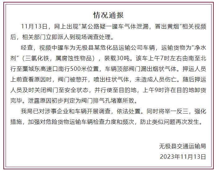 经查,视频中罐车为无极县某危化品运输公司车辆,运输货物为“净水剂”(三氯化铁,属腐蚀性物品),装载30吨。该车上午7时左右由南至北行至藁城东高速口南行500米位置,车辆顶部阀门漏出烟状气体。押运人员上前查看原因时,阀门被憋开,喷出柱状气体,未造成人员伤亡。随后押运人员及时关闭阀门至安全状态,并行驶至目的地,上午9时许在目的地卸货完毕。泄露原因初步判定为阀门排气孔堵塞所致。