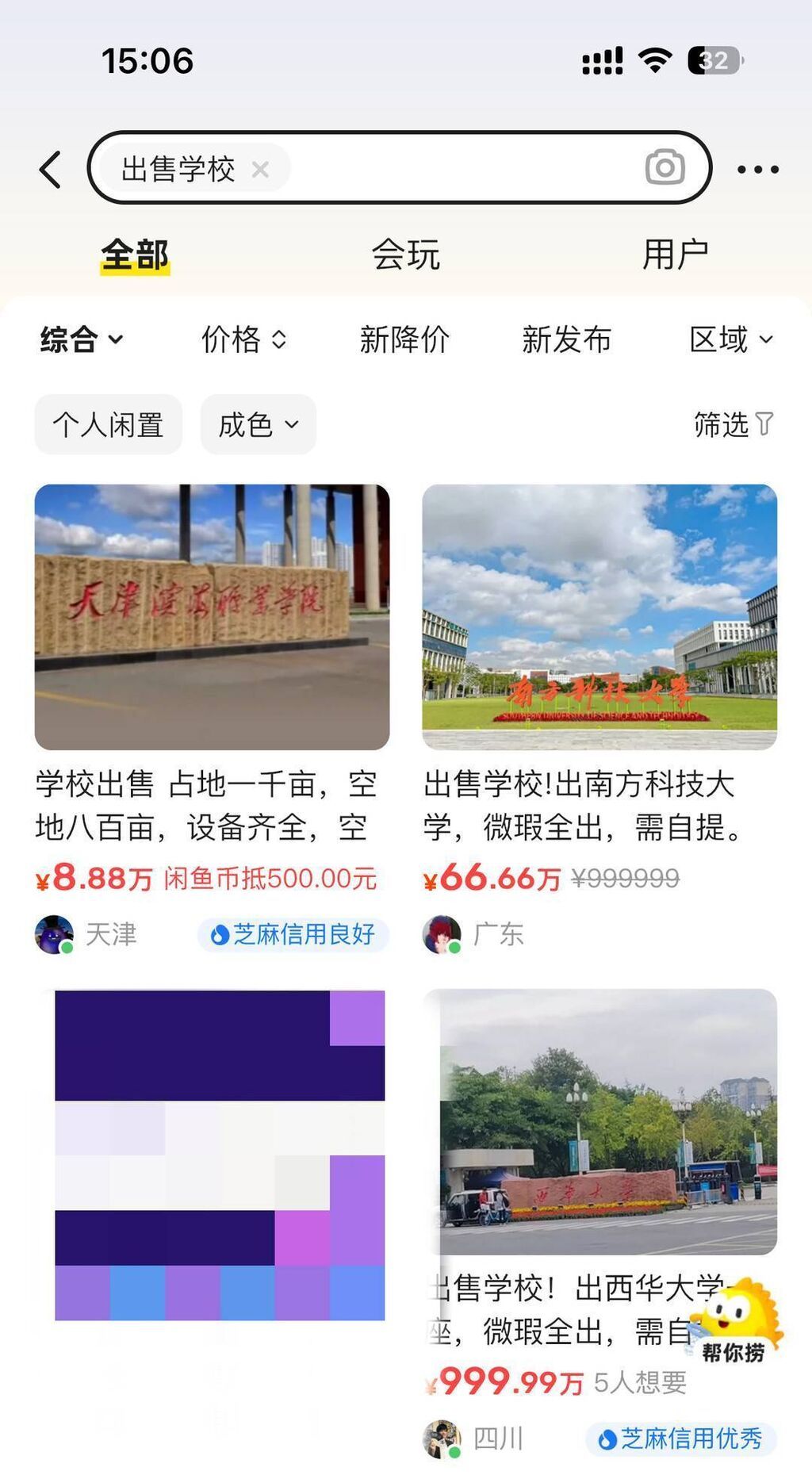 对此,闲鱼作为闲置交易平台,郑重提醒广大用户,学校是学习知识的地方,作为公共资产,不可通过私人途径进行出售、赠与。此外,通过将学校挂上闲鱼的方式躲避上学,大概率是不可行的。希望消费者们能擦亮眼睛,注意甄别。