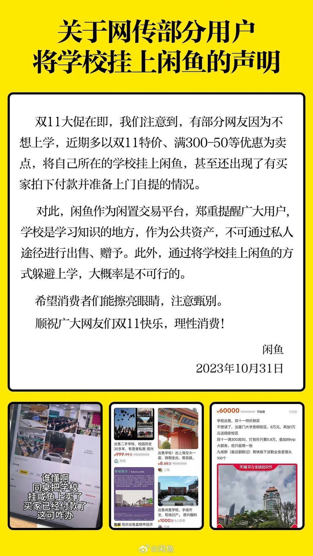 10月31日,闲鱼发布声明称,双11大促在即,我们注意到,有部分网友因为不想上学,近期多以双11特价、满300-50等优惠为卖点,将自己所在的学校挂上闲鱼,甚至还出现了有买家拍下付款并准备上门自提的情况。
