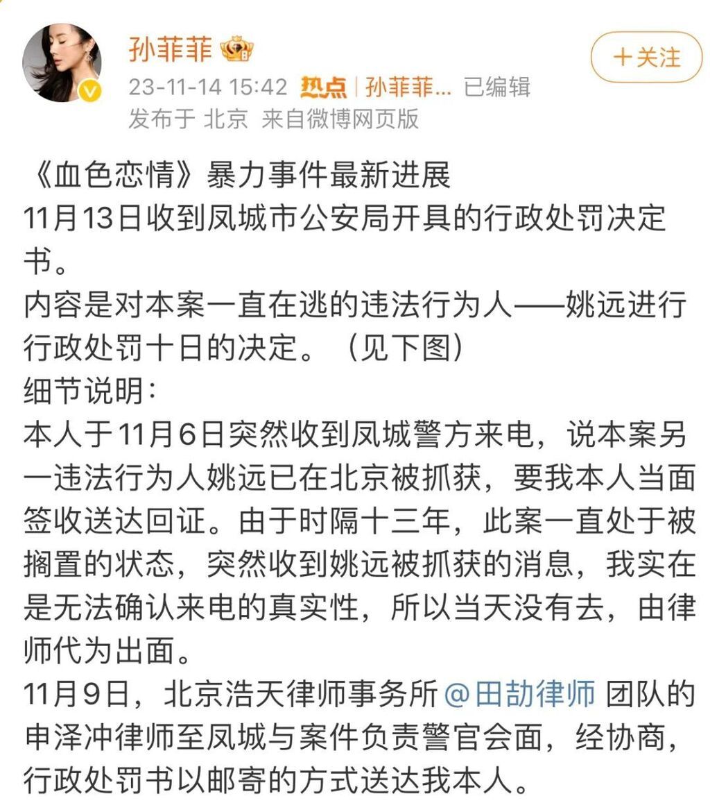 11月14日,孙菲菲晒出自己遭遇的《血色恋情》剧组暴力事件最新进展:辽宁丹东凤城市公安局开具的行政处罚决定书显示,该局对姚某作出行政拘留十日并罚款五百元的决定。