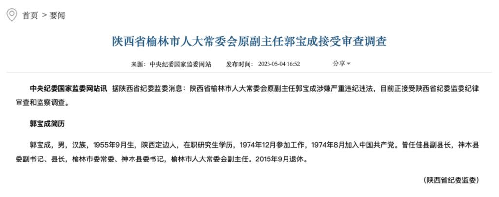日前,延安市人民检察院依法以涉嫌受贿罪对郭宝成作出逮捕决定。