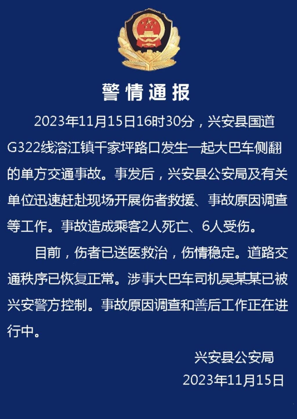 桂林兴安县一大巴车侧翻造成2死6伤,司机被警方控制