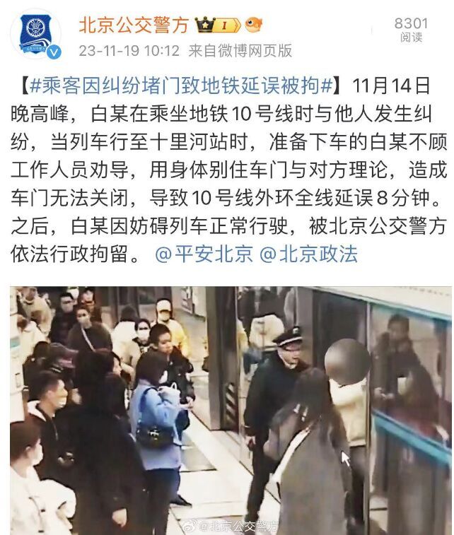 原标题:北京一乘客因纠纷堵门致地铁10号线延误8分钟 已被行政拘留