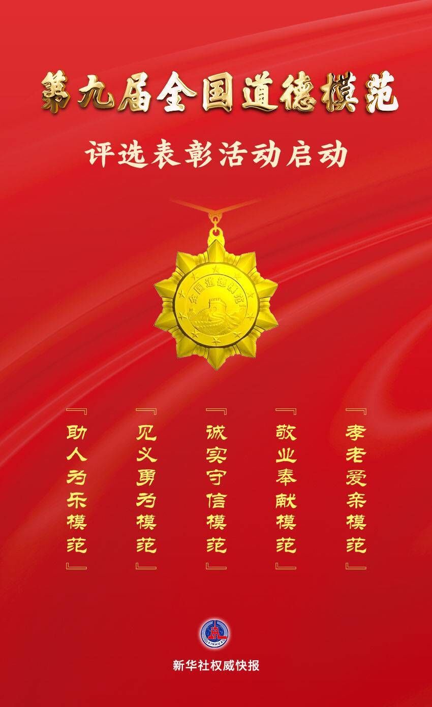 据悉,第九届全国道德模范分为“助人为乐模范”“见义勇为模范”“诚实守信模范”“敬业奉献模范”“孝老爱亲模范”5个类别,通过群众推荐、遴选审核、公示宣传、投票评选等步骤评选产生。