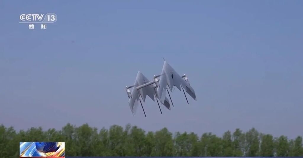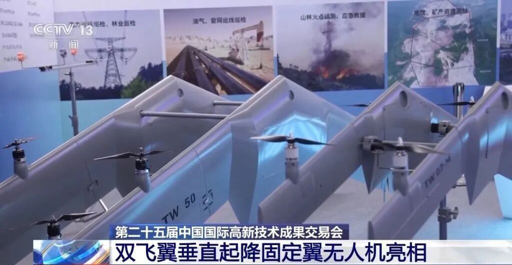 我国的无人机产业近年来发展迅速,技术在全球处于领先地位。在第二十五届中国国际高新技术成果交易会上,一款国产全球首创的双飞翼垂直起降固定翼无人机与公众见面。它可以实现竖直状态下的垂直起降,起飞后,又可以实现正常的平飞。