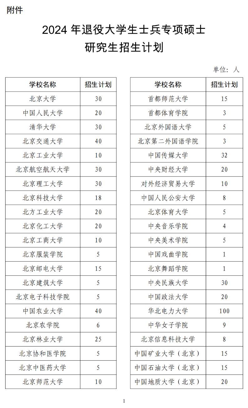 2024年全国“退役大学生士兵计划”由北京大学、清华大学等520所普通高等学校承担。该专项计划在全国硕士研究生招生计划总规模内单列下达、专项使用,不得调整为普通计划或其他专项计划。