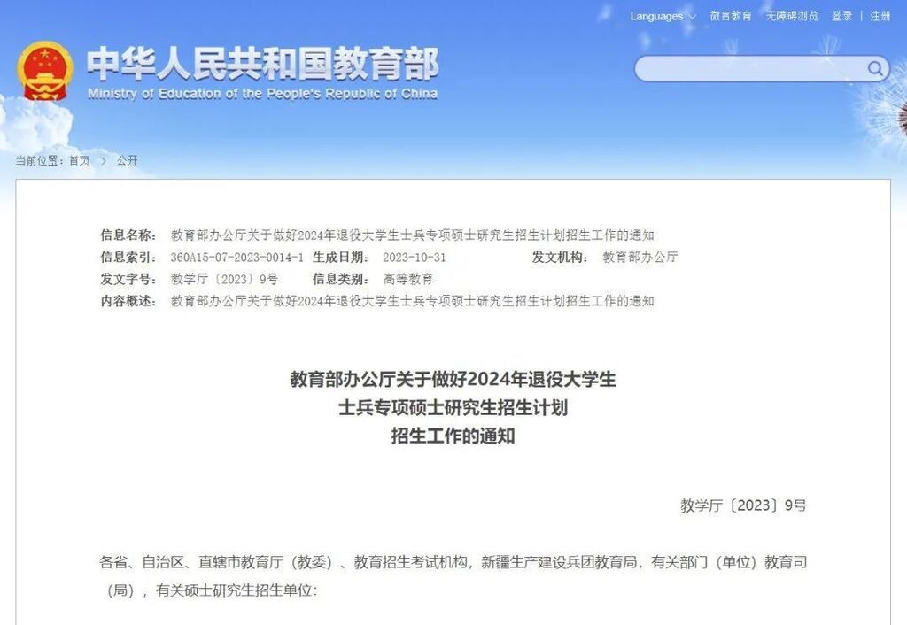 为鼓励高校学生参军入伍,拓宽退役大学生士兵成长成才通道,教育部决定2024年继续实施退役大学生士兵专项硕士研究生招生计划(以下简称“退役大学生士兵计划”)。现就做好有关工作通知如下。